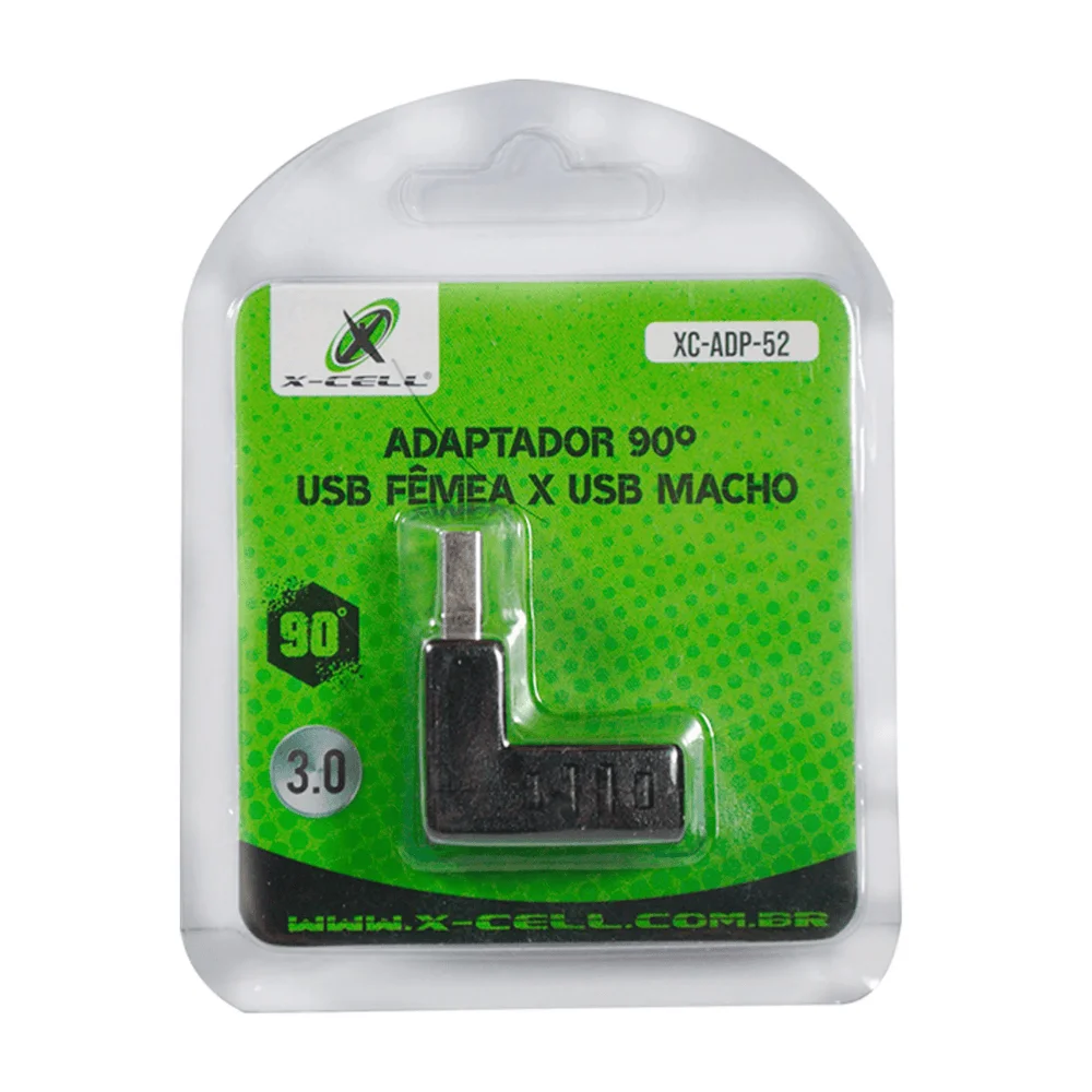 o adaptador xc-adp-52 usb 90° 3.0 com ultra velocidade conta com usb fêmea para usb macho sendo perfeito para conectar aquele acessório ou máquina que esteja encostado a uma parede ou móvel com espaço reduzido.