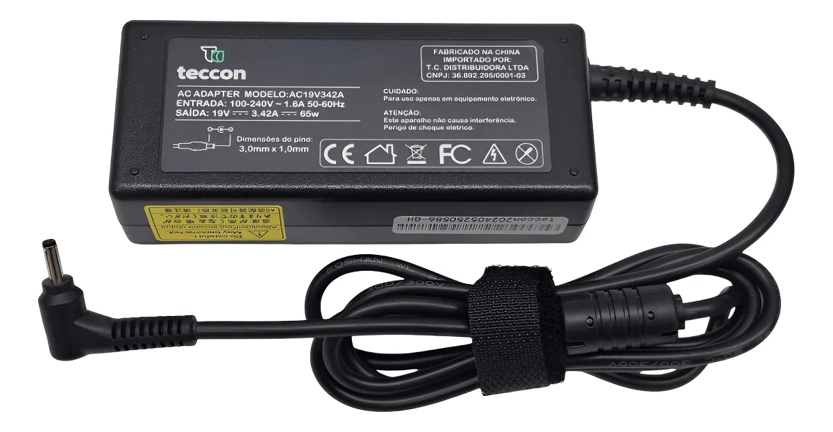 • A Fonte 19V 3.42A 65W da Teccon é fabricada com as mesmas especificações técnicas da fonte original, seguindo rigorosamente o padrão do fabricante. É um produto de reposição compatível com o seu notebook e com ótimo custo-benefício. Cabo de força para conexão já está incluso.